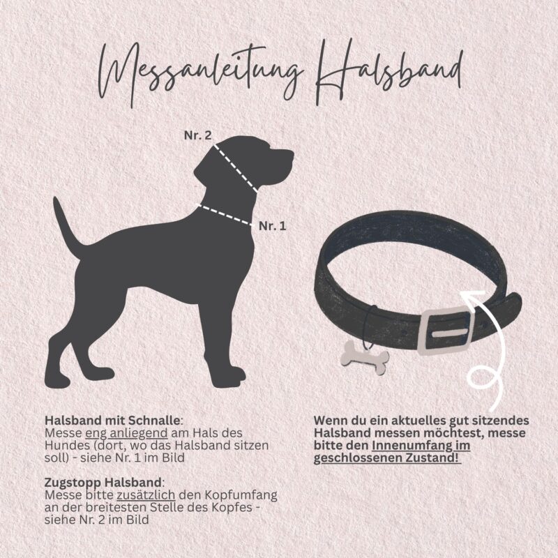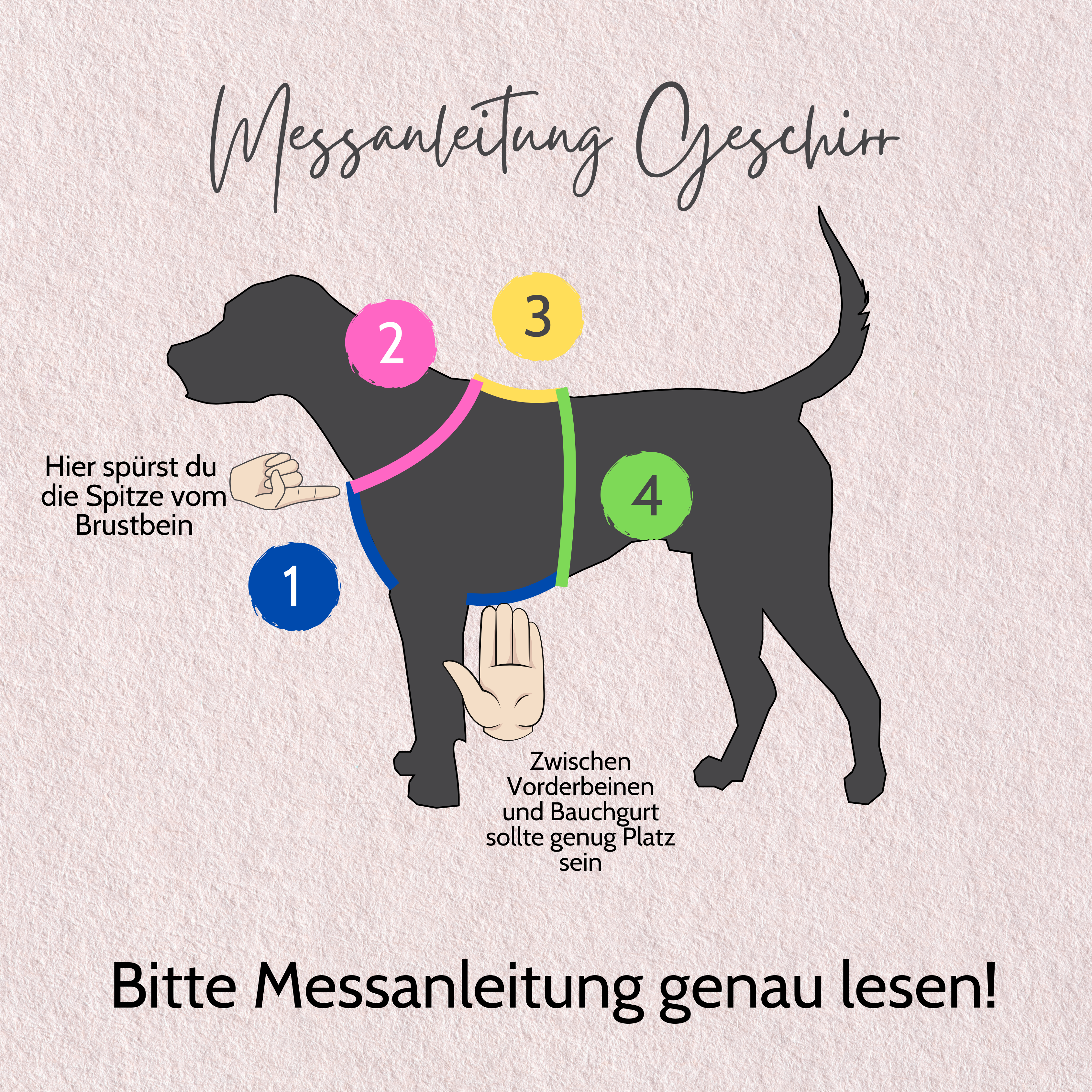 Bitte nutze zum Messen ein flexibles Maßband und messe direkt an deinem Hund (bitte keine bestehenden Geschirre messen). Dein Hund sollte dabei stehen und nicht sitzen oder liegen – das würde das Messergebnis verfälschen.